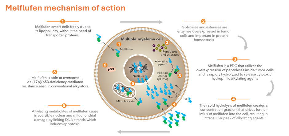Melflufen enters cells freely due to its lipophilicity, without the need for transporter proteins. Melflufen is rapidly hydrolyzed by peptidases and esterases, which are overexpressed in tumor cells. The hydrolysis creates a concentration gradient that drives further influx of melflufen into the cell, resulting in intracellular accumulation of alkylating agents. This leads to rapid and irreversible nuclear and mitochondrial DNA damage and induction of apoptosis.1-5,9
