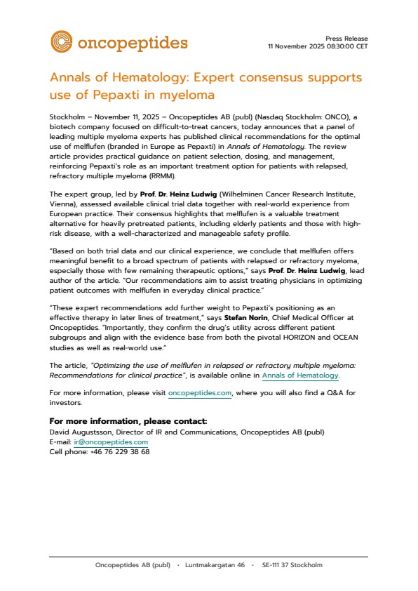 Stockholm – November 11, 2025 – Oncopeptides AB (publ) (Nasdaq Stockholm: ONCO), a biotech company focused on difficult-to-treat cancers, today announces that a panel of leading multiple myeloma experts has published clinical recommendations for the optimal use of melflufen (branded in Europe as Pepaxti) in Annals of Hematology. The review article provides practical guidance on patient selection, dosing, and management, reinforcing Pepaxti’s role as an important treatment option for patients with relapsed, refractory multiple myeloma (RRMM).
