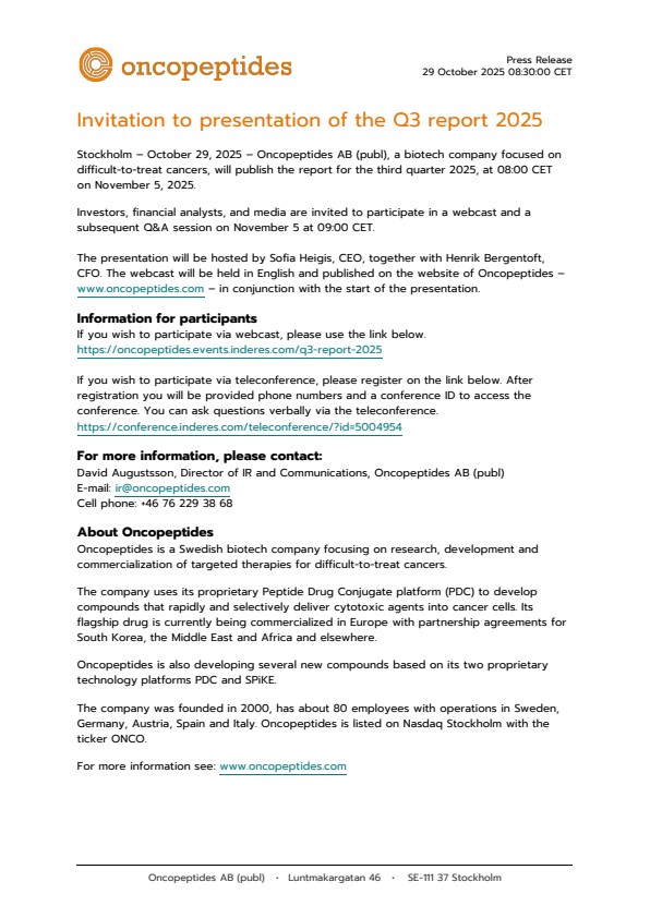 Stockholm – October 29, 2025 – Oncopeptides AB (publ), a biotech company focused on difficult-to-treat cancers, will publish the report for the third quarter 2025, at 08:00 CET on November 5, 2025.