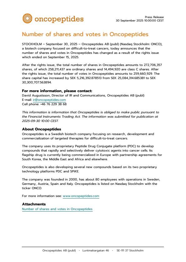 STOCKHOLM – September 30, 2025 – Oncopeptides AB (publ) (Nasdaq Stockholm: ONCO), a biotech company focused on difficult-to-treat cancers, today announces that the number of shares and votes in Oncopeptides has changed as a result of the rights issue which ended on September 15, 2025.