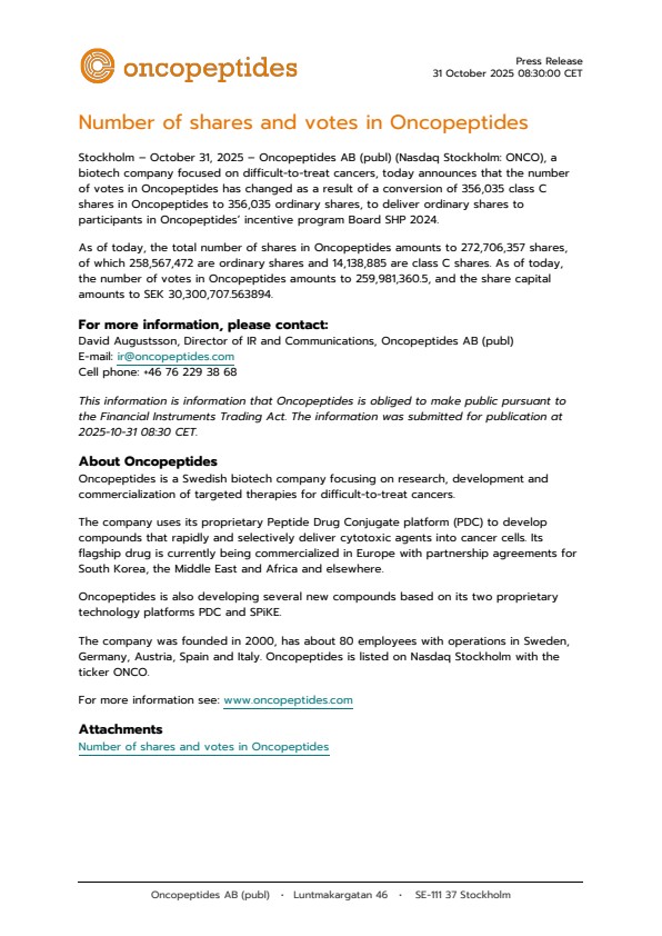 Stockholm – October 31, 2025 – Oncopeptides AB (publ) (Nasdaq Stockholm: ONCO), a biotech company focused on difficult-to-treat cancers, today announces that the number of votes in Oncopeptides has changed as a result of a conversion of 356,035 class C shares in Oncopeptides to 356,035 ordinary shares, to deliver ordinary shares to participants in Oncopeptides’ incentive program Board SHP 2024.