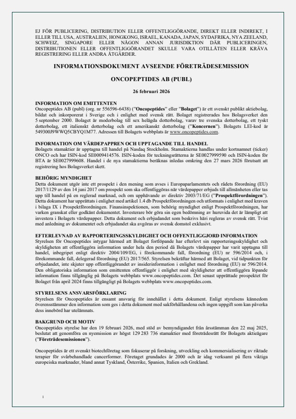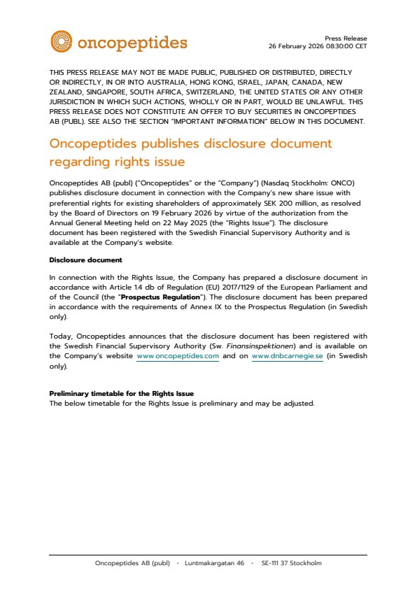 Oncopeptides AB (publ) (“Oncopeptides” or the “Company”) (Nasdaq Stockholm: ONCO) publishes disclosure document in connection with the Company’s new share issue with preferential rights for existing shareholders of approximately SEK 200 million, as resolved by the Board of Directors on 19 February 2026 by virtue of the authorization from the Annual General Meeting held on 22 May 2025 (the “Rights Issue”). The disclosure document has been registered with the Swedish Financial Supervisory Authority and is available at the Company’s website.