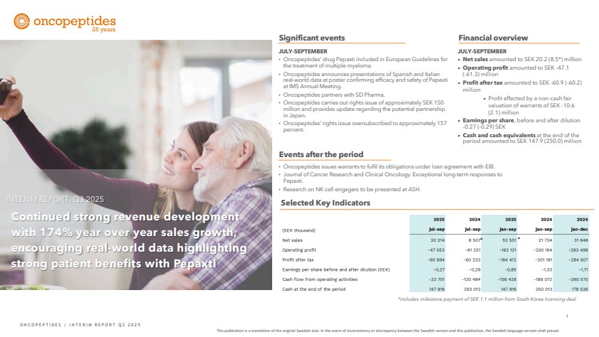 The third quarter of 2025 was a solid and strategically important period for Oncopeptides as we reached several important milestones for continued growth into 2026, both financially and scientifically. Net sales amounted to SEK 20.2 million, representing a continued growth of 174 percent year over year and 5 percent compared to the previous quarter, confirming the sustained positive trend across our key European markets. We remain on track to cash flow positive by end of 2026. Meanwhile, our negotiations with two potential Japanese partners continues to progress according to plan.