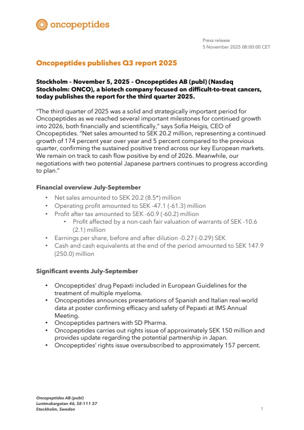 Stockholm – November 5, 2025 – Oncopeptides AB (publ) (Nasdaq Stockholm: ONCO), a biotech company focused on difficult-to-treat cancers, today publishes the report for the third quarter 2025.