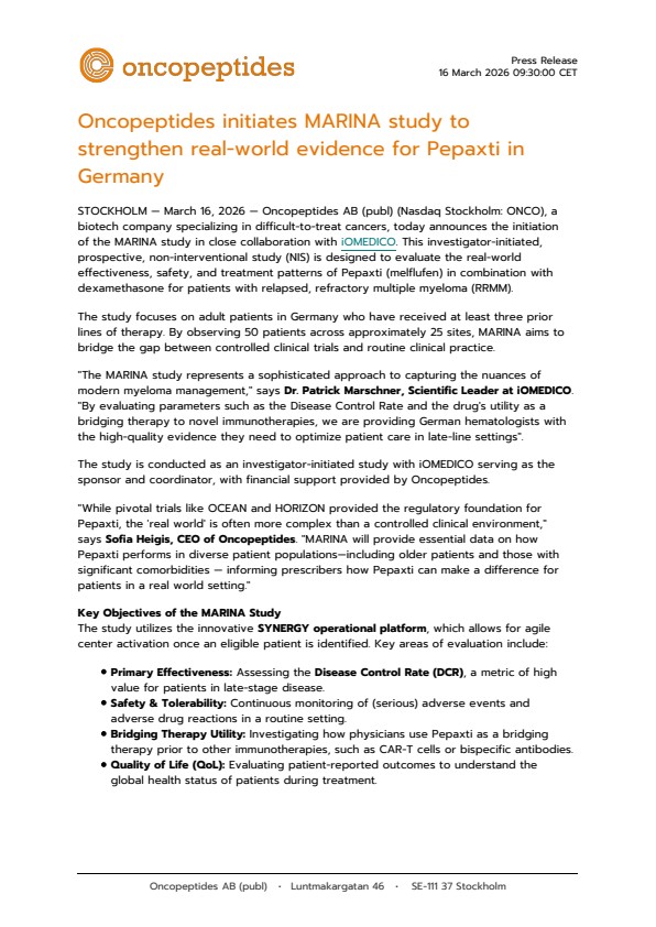 STOCKHOLM — March 16, 2026 — Oncopeptides AB (publ) (Nasdaq Stockholm: ONCO), a biotech company specializing in difficult-to-treat cancers, today announces the initiation of the MARINA study in close collaboration with iOMEDICO. This investigator-initiated, prospective, non-interventional study (NIS) is designed to evaluate the real-world effectiveness, safety, and treatment patterns of Pepaxti (melflufen) in combination with dexamethasone for patients with relapsed, refractory multiple myeloma (RRMM).