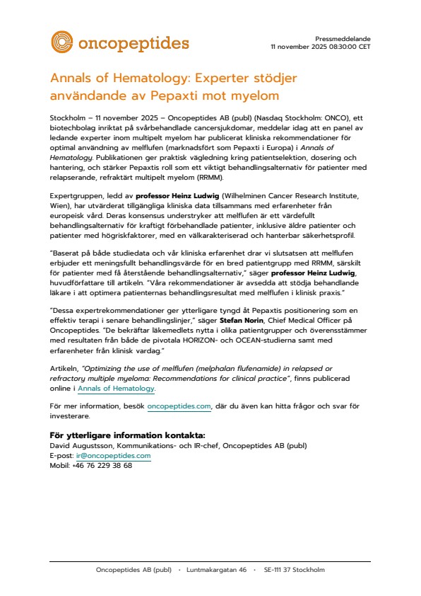 Stockholm – 11 november 2025 – Oncopeptides AB (publ) (Nasdaq Stockholm: ONCO), ett biotechbolag inriktat på svårbehandlade cancersjukdomar, meddelar idag att en panel av ledande experter inom multipelt myelom har publicerat kliniska rekommendationer för optimal användning av melflufen (marknadsfört som Pepaxti i Europa) i Annals of Hematology. Publikationen ger praktisk vägledning kring patientselektion, dosering och hantering, och stärker Pepaxtis roll som ett viktigt behandlingsalternativ för patienter med relapserande, refraktärt multipelt myelom (RRMM).