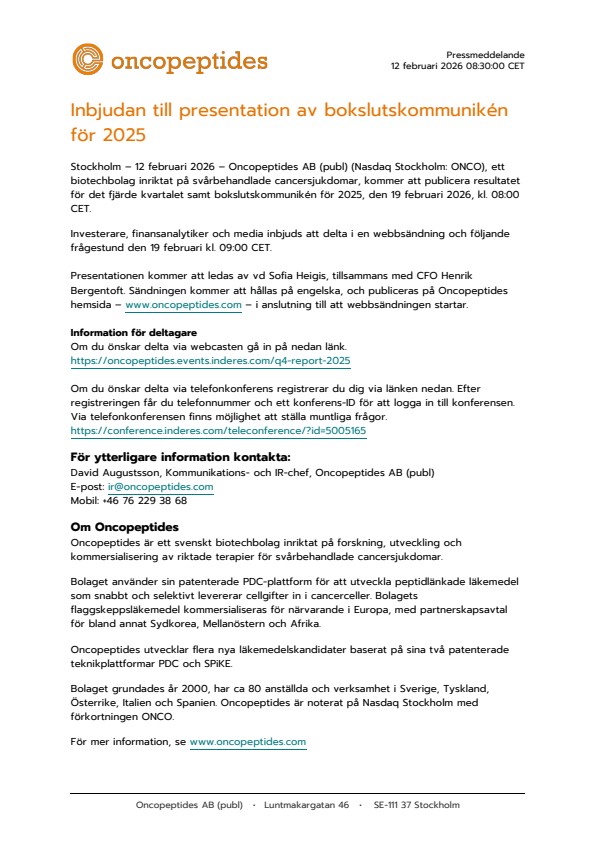 Stockholm – 12 februari 2026 – Oncopeptides AB (publ) (Nasdaq Stockholm: ONCO), ett biotechbolag inriktat på svårbehandlade cancersjukdomar, kommer att publicera resultatet för det fjärde kvartalet samt bokslutskommunikén för 2025, den 19 februari 2026, kl. 08:00 CET.