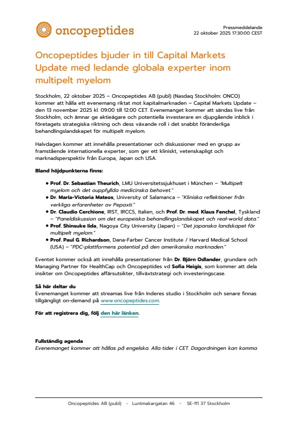 Stockholm, 22 oktober 2025 – Oncopeptides AB (publ) (Nasdaq Stockholm: ONCO) kommer att hålla ett evenemang riktat mot kapitalmarknaden – Capital Markets Update – den 13 november 2025 kl. 09:00 till 12:00 CET. Evenemanget kommer att sändas live från Stockholm, och ämnar ge aktieägare och potentiella investerare en djupgående inblick i företagets strategiska riktning och dess växande roll i det snabbt föränderliga behandlingslandskapet för multipelt myelom.