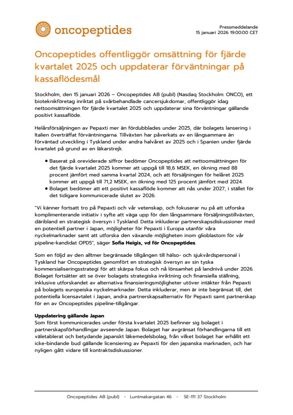 Stockholm, den 15 januari 2026 – Oncopeptides AB (publ) (Nasdaq Stockholm: ONCO), ett bioteknikföretag inriktat på svårbehandlade cancersjukdomar, offentliggör idag nettoomsättningen för fjärde kvartalet 2025 och uppdaterar sina förväntningar gällande positivt kassaflöde.
