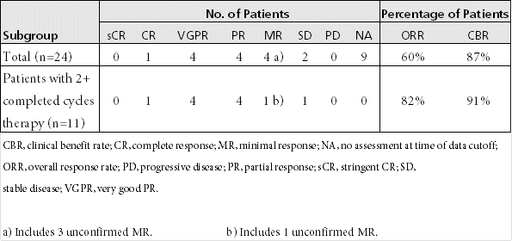 Medianbehandlingstiden var 7,4 månader. Fyra patienter var fortsatt under behandling vid tidpunkten för datainsamling medan en patient avslutat behandlingen efter 10 månader p.g.a. sjukdomsprogression. Två patienter uppnådde s.k. Very Good Partial Response (VGPR) och tre patienter uppnådde s.k. Partial Response (PR) vilket motsvarar en total tumörsvarsfrekvens om 100% (ORR).