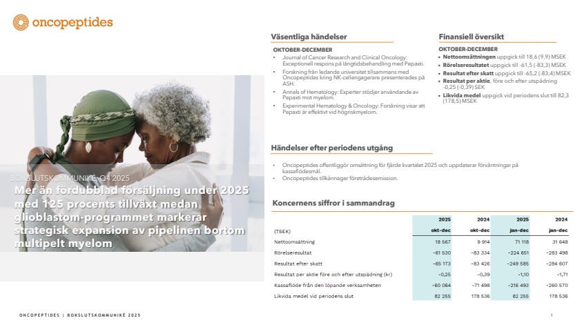 Sett över helåret uppvisade Oncopeptides ett starkt kommersiellt momentum under 2025, där nettoomsättningen mer än fördubblades till 71,1 MSEK, vilket motsvarar en ökning med 125 procent jämfört med 2024. För det fjärde kvartalet uppgick nettoomsättningen till 18,6 MSEK, en ökning med 88 procent på årsbasis. Detta resultat återspeglar den ihållande efterfrågan på Pepaxti, särskilt i Italien där lanseringen har överträffat våra initiala förväntningar. Inför 2026 kommer vi utveckla våra pipelinetillgångar baserade på peptiddrogskonjugat-plattformen (PDC) bortom multipelt myelom till andra sjukdomsområden, vilket möjliggör en betydande framtida potential.