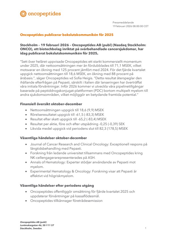 Stockholm – 19 februari 2026 – Oncopeptides AB (publ) (Nasdaq Stockholm: ONCO), ett biotechbolag inriktat på svårbehandlade cancersjukdomar, har idag publicerat bokslutskommunikén för 2025.