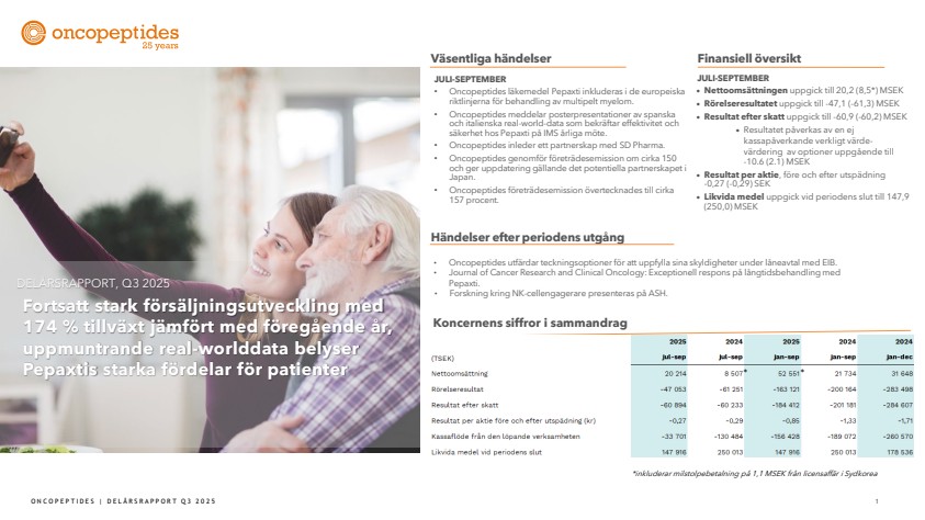 Det tredje kvartalet 2025 var en solid och strategiskt viktig period för Oncopeptides där vi nådde flera viktiga milstolpar för fortsatt tillväxt under 2026 – både finansiellt och vetenskapligt. Nettoomsättningen uppgick till 20,2 MSEK, vilket motsvarar en försäljningstillväxt på 174 procent jämfört med samma kvartal föregående år och 5 procent jämfört med föregående kvartal. Detta bekräftar den positiva trenden på våra viktigaste europeiska marknader. Vi ligger fortsatt i linje med vår målsättning att nå ett positivt kassaflöde mot slutet av 2026. Samtidigt fortskrider förhandlingarna med två potentiella partners i Japan enligt plan.