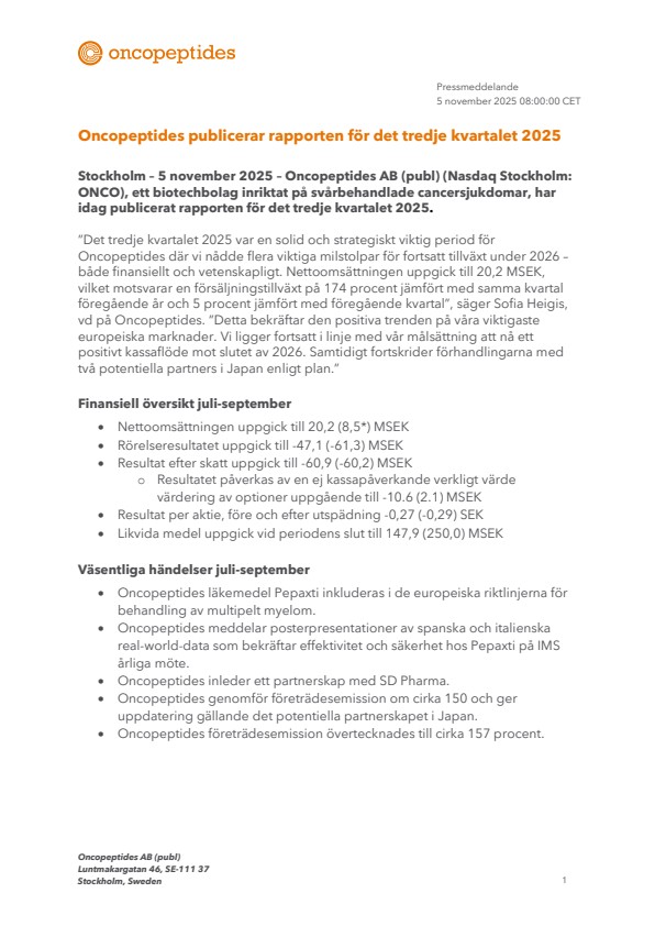 Stockholm – 5 november 2025 – Oncopeptides AB (publ) (Nasdaq Stockholm: ONCO), ett biotechbolag inriktat på svårbehandlade cancersjukdomar, har idag publicerat rapporten för det tredje kvartalet 2025.